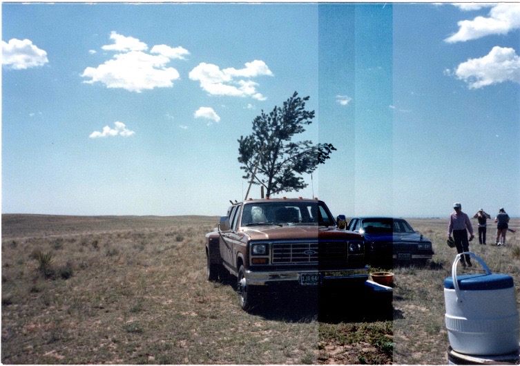 Once upon a time, in early 1988, Noah and I set out on the unbelievable journey of building our beautiful home in Hanover, with the help of our wonderful family and friends. Our land was way out on the prairie east of Colorado Springs, where Ursula, Ken, Lawrence, and Omi lived at the time. The area was only grasslands, not a tree in sight for miles. As luck would have it, there was a tree in Ursula’s side yard that Omi wanted taken down, I think for room for a garden or flowers. We dug it up and transplanted it to our barren prairie land, where, with a lot of TLC, it thrived and lived happily ever after, for the 18 years we lived there! Well, except for one little mishap… we rednecks were shooting one day, and one of Noah’s firefighter friends shot one of the branches off. ): We had 35 acres, and he had to hit our one and only tree. I don’t know if the Omi tree still stands, but it was so special to us!